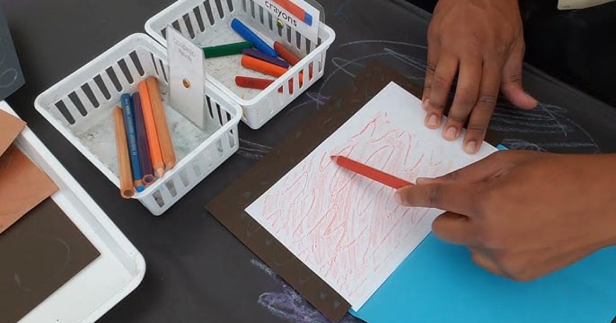 Young artists can experiment with texture and color by learning to use rubbing plates to create patterns on paper.