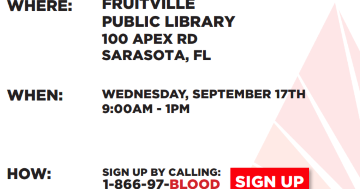 Suncoast Blood Center will be in the parking lot from 9 a.m. to 1:00 p.m.
