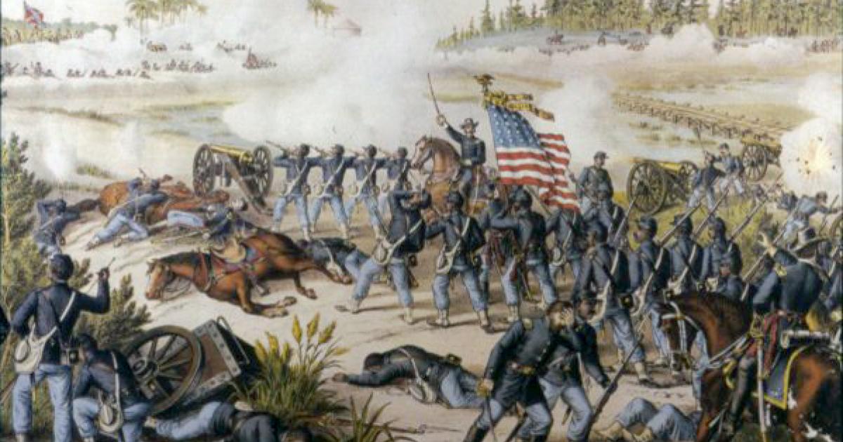 The image is a lithograph of the 1864 Battle of Olustee from Florida Memory.